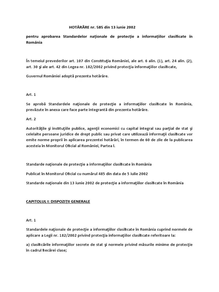 Hotararea Guvernului 585 Din 2002 Proaspat. 585 din 13 iunie 2002 (*actualizata*) pentru aprobarea standardelor nationale de protectie a informatiilor clasificate in romania (actualizata pana la data de 24 martie 2005*) emitent: Standarde naţionale de protecţie a informaţiilor clasificate în românia publicat în monitorul oficial cu numărul 485 din data de 5 iulie 2002. 585 din 13 iunie 2002 pentru aprobarea standardelor nationale de protectie a informatiilor clasificate in romania emitent: