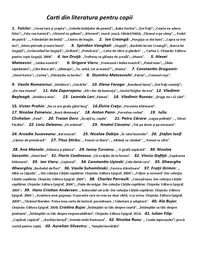 Facem această precizare pentru că unele culegeri de texte literare cuprind multe texte uşoare, dar nu fac parte din … Indiferent ca ne referim la carti de colorat, basme, proverbe ori ghicitori sau la atlase, enciclopedii si dictionare, colectia dedicata copiiilor contribuie la formarea viitoarei noastre generatii. Ceea ce este important este faptul că tot ce li se recomandă copiilor pentru citit trebuie să facă parte din literatura română sau literatura universală.
